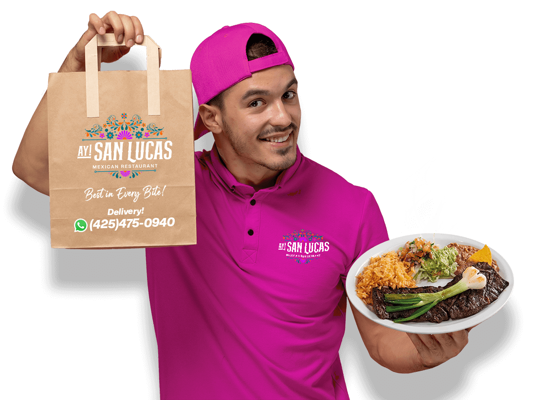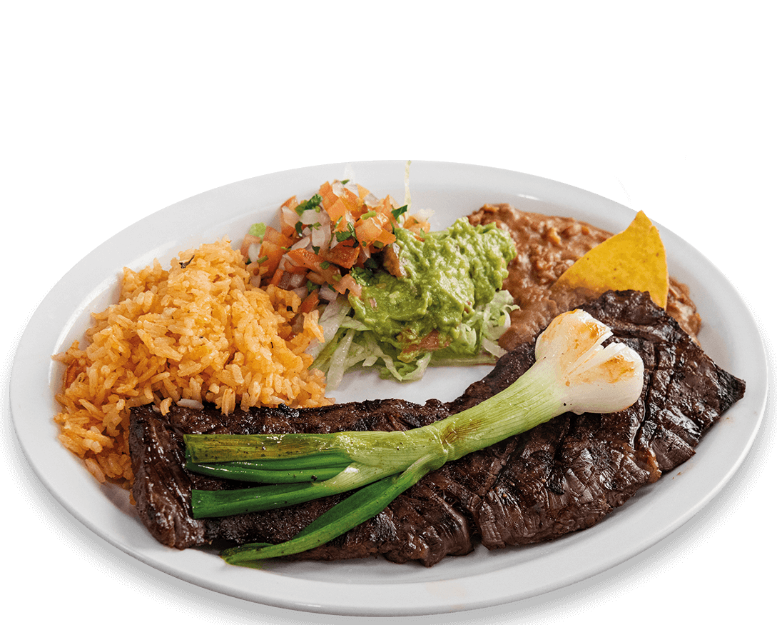 Two soft tacos with pork marinated in our savory red sauce. Topped with cilantro and onions. Served with rice and beans.